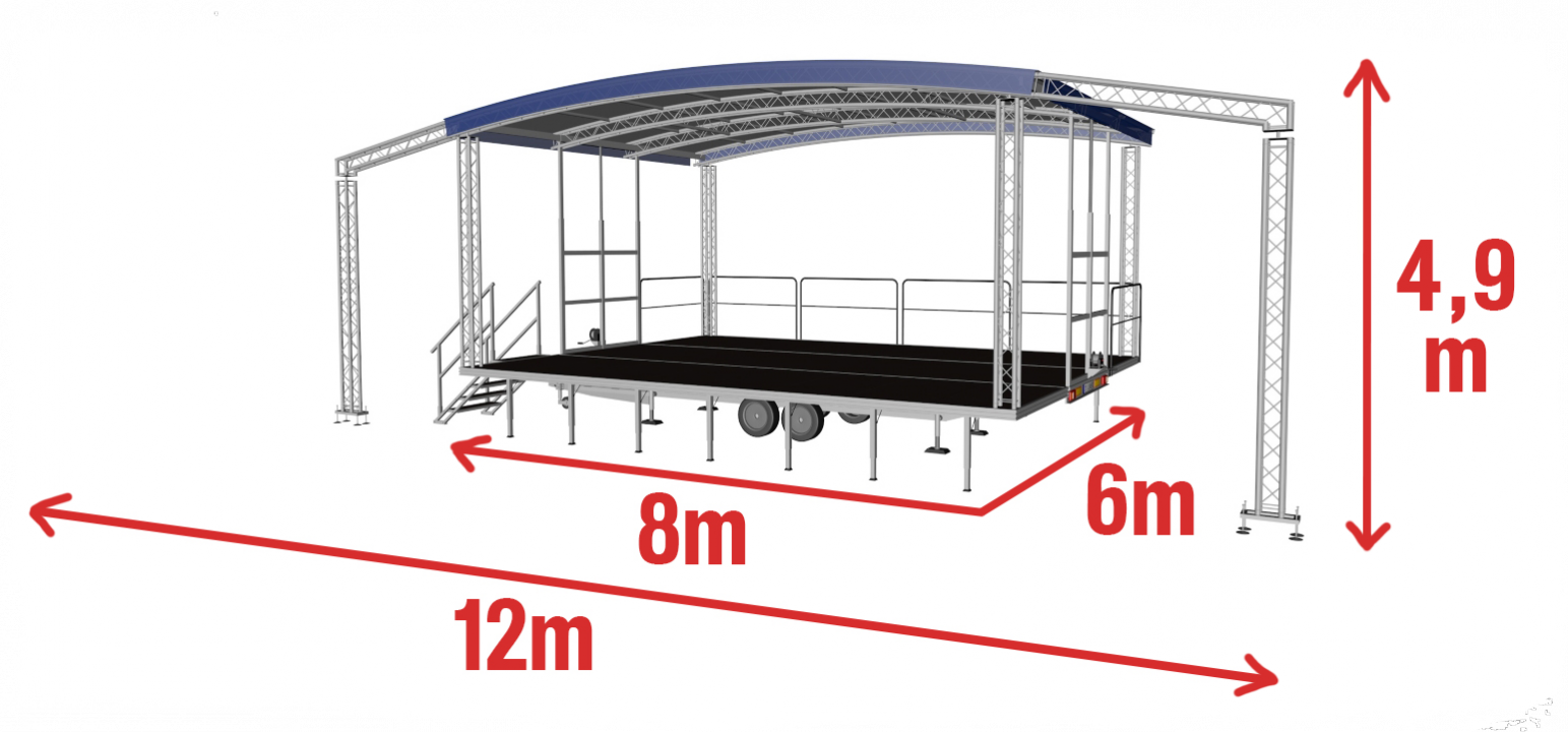 Der Vorteil gegenüber einer traditionellen Bühne, welche aus einzelnen Bauteilen zusammengesetzt wird, liegt in der Geschwindigkeit beim Aufbau. Diese mobile Showbühne ist sehr schnell auf- und abgebaut.
